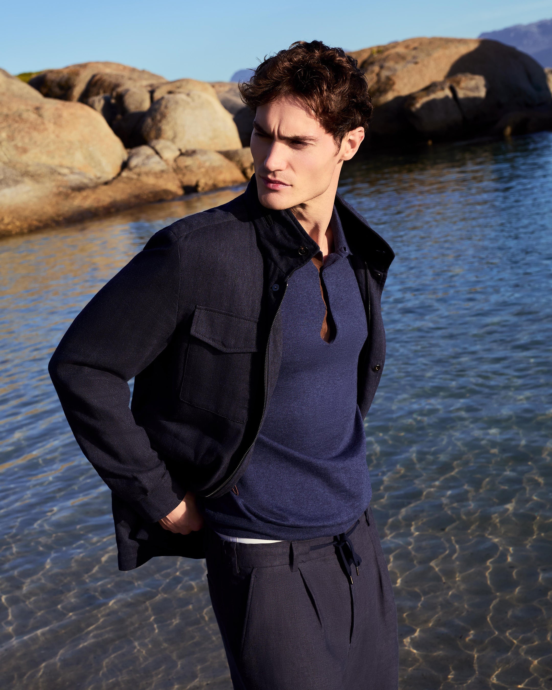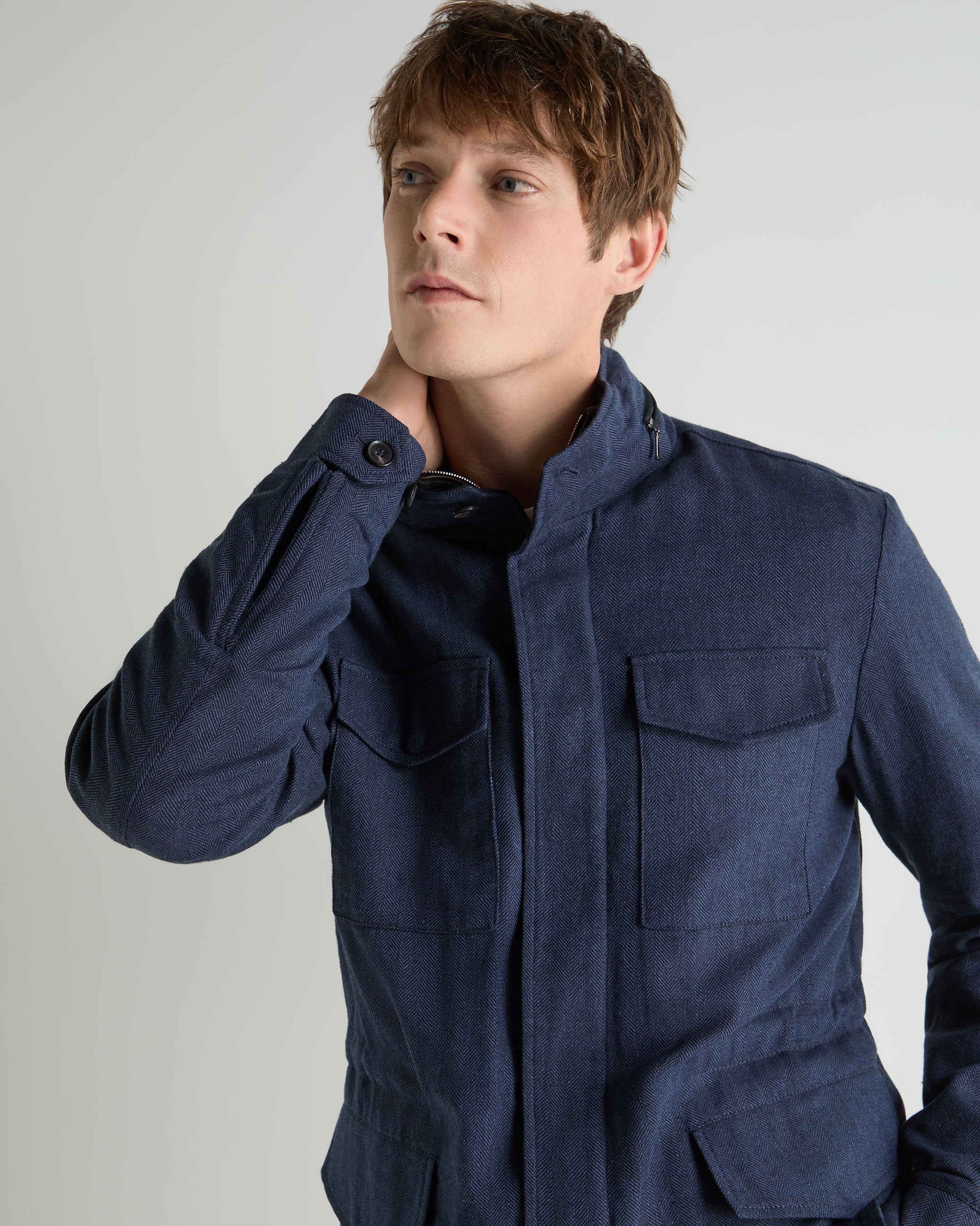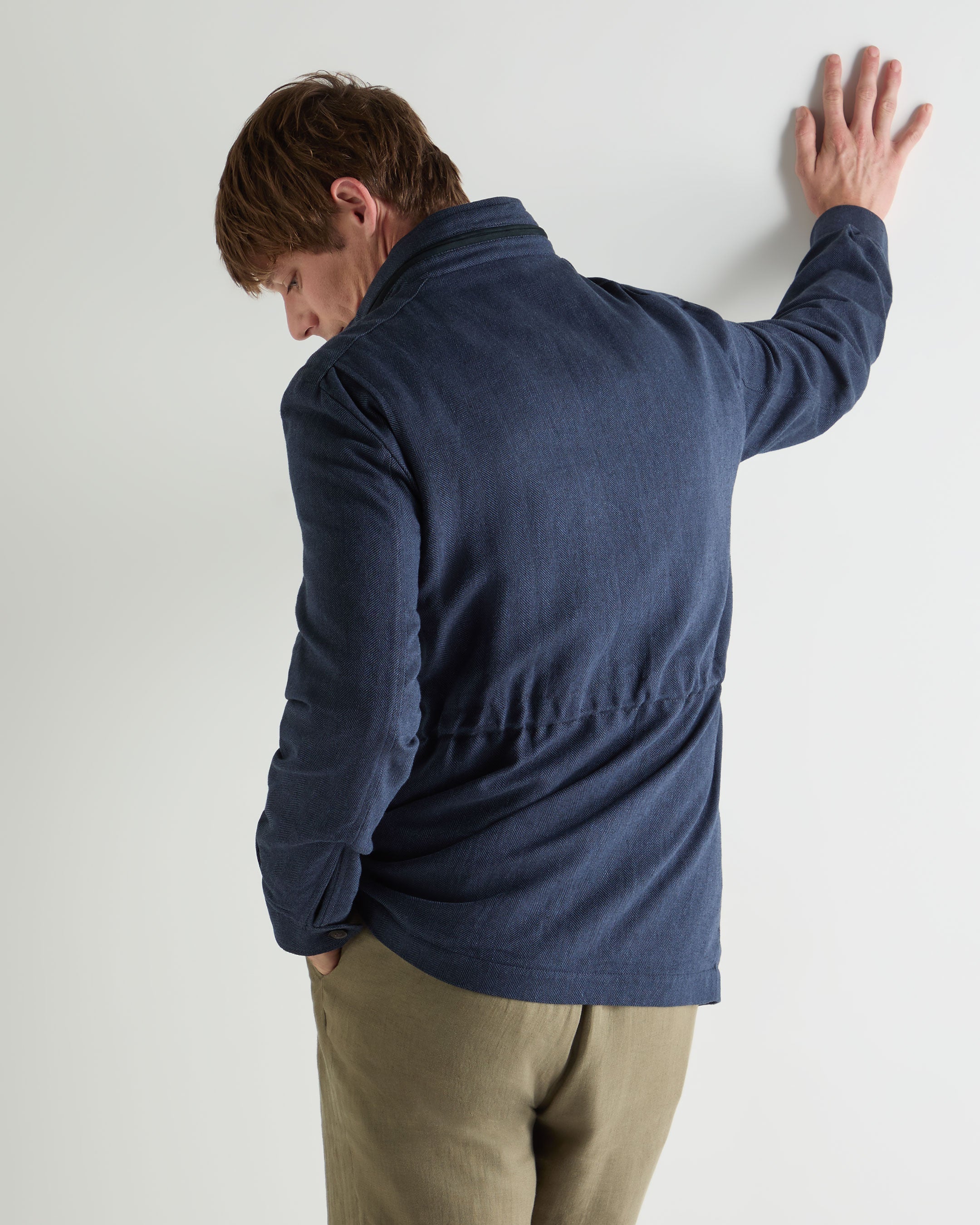 A refined interpretation of the field jacket, designed for warmer journeys and unhurried days outdoors. Cut in a linen-rich blend with a subtle herringbone texture, this piece balances relaxed utility with a polished sensibility — ideal for travel, countryside walks and city days that drift into evening.