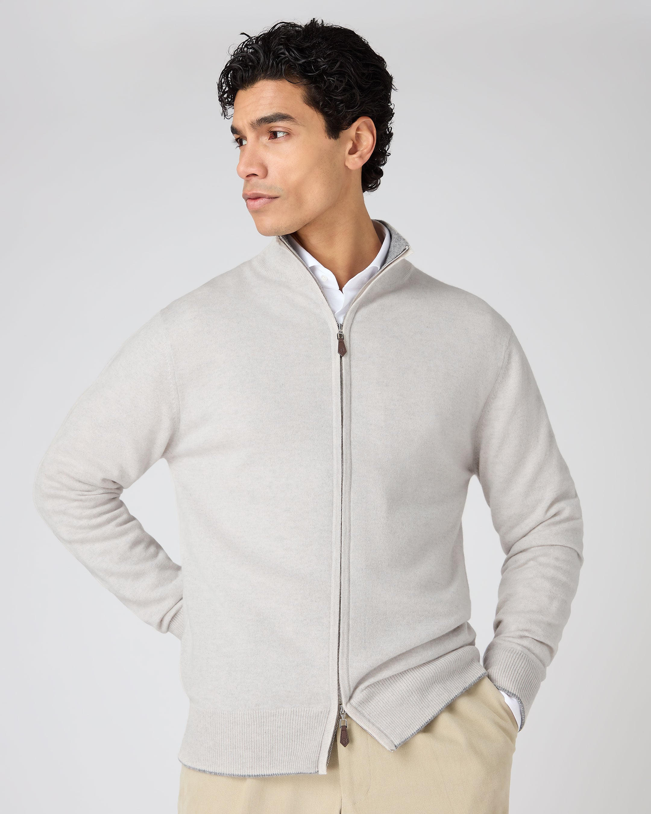 A refined staple for effortless layering, this full-zip jumper combines contemporary versatility with timeless appeal. Knitted from 100% organic 1-ply cashmere, it delivers a luxuriously soft feel and breathable warmth — equally suited to relaxed weekends or polished travel dressing.