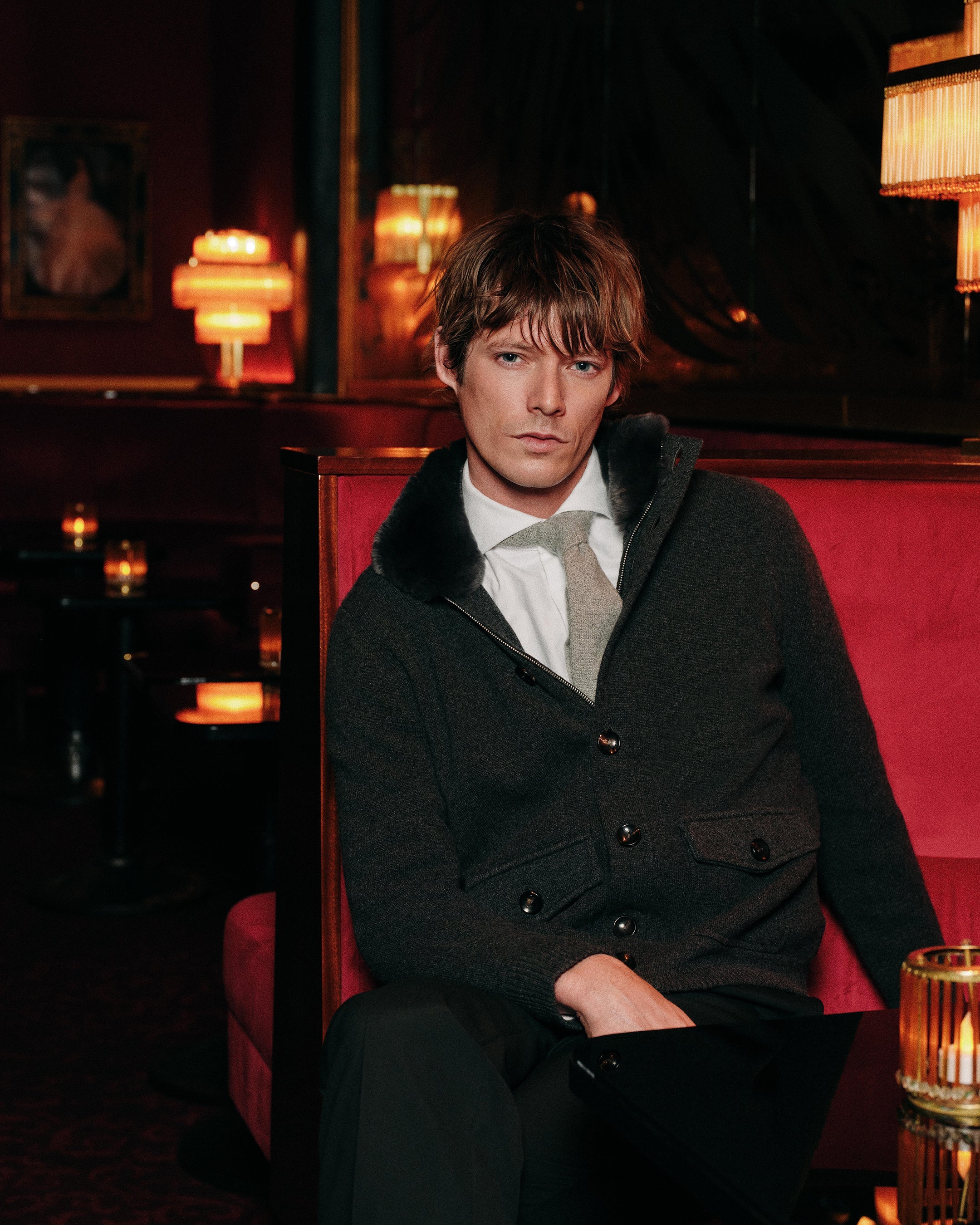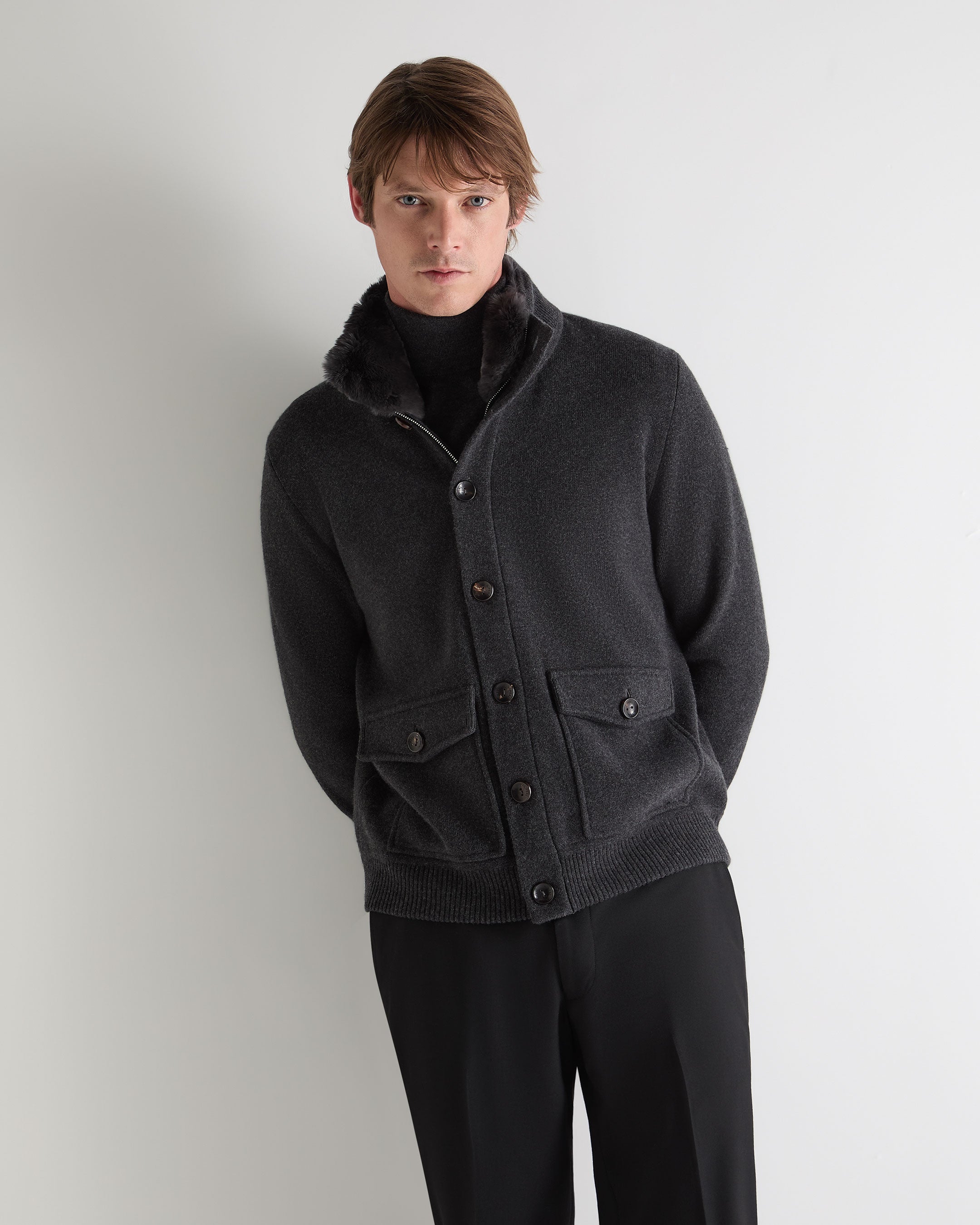 - Made from 100% Mongolian cashmere with a dark grey fur collar