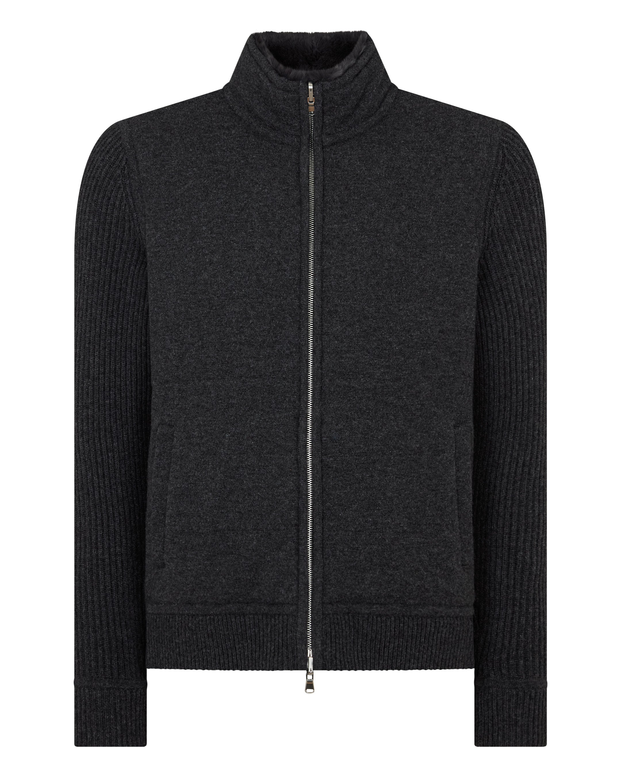 Designed to move with you from city to countryside, this padded zip-through cashmere jacket blends the lightweight warmth of 1-ply pure cashmere with the comfort of ribbed sleeves and the luxe touch of a fur-lined collar. Its clean silhouette is elevated by a two-way zip and discreet side pockets, making it a polished essential for transitional layering.