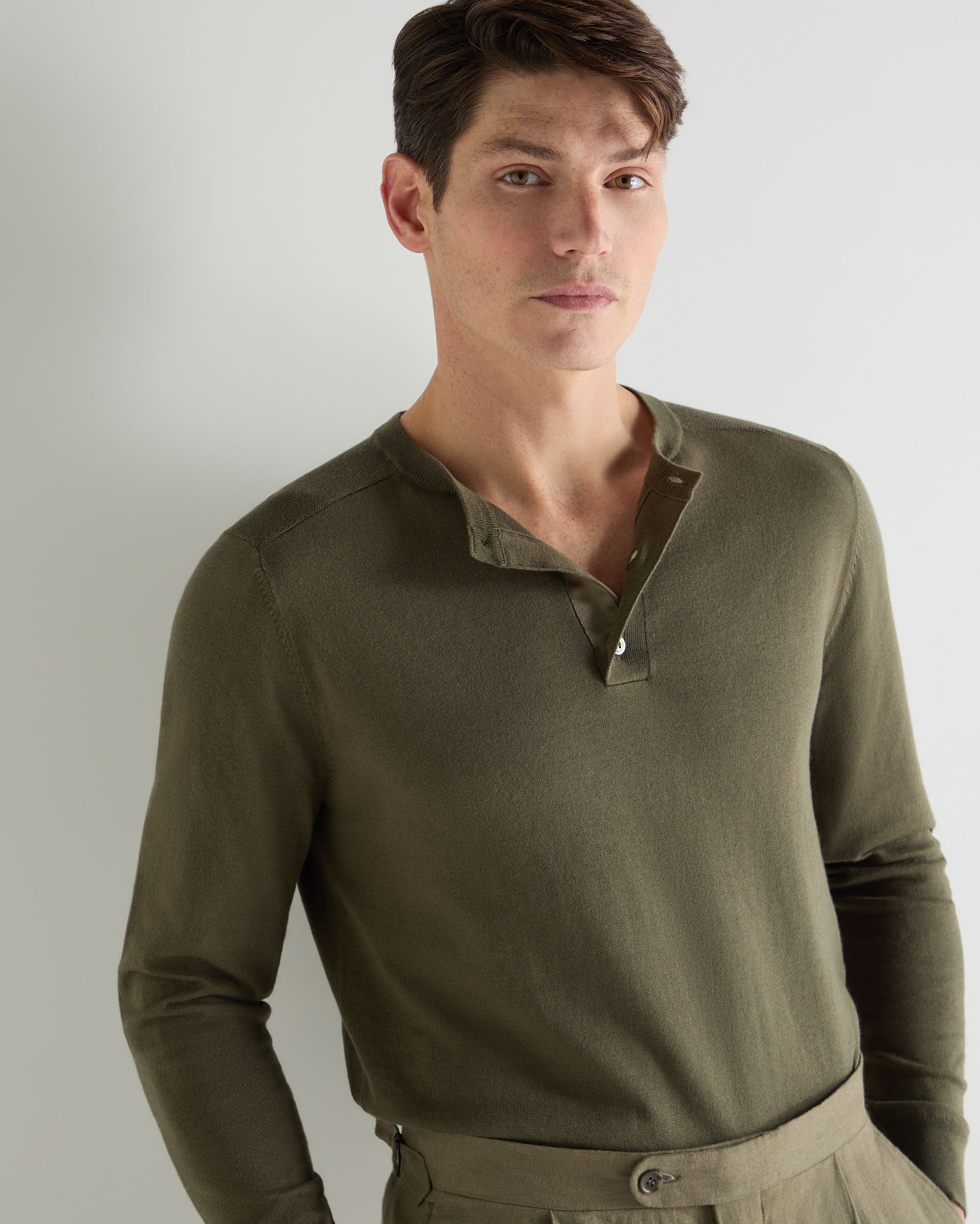 Men's Round Neck Cotton Cashmere Henley In Khaki Green