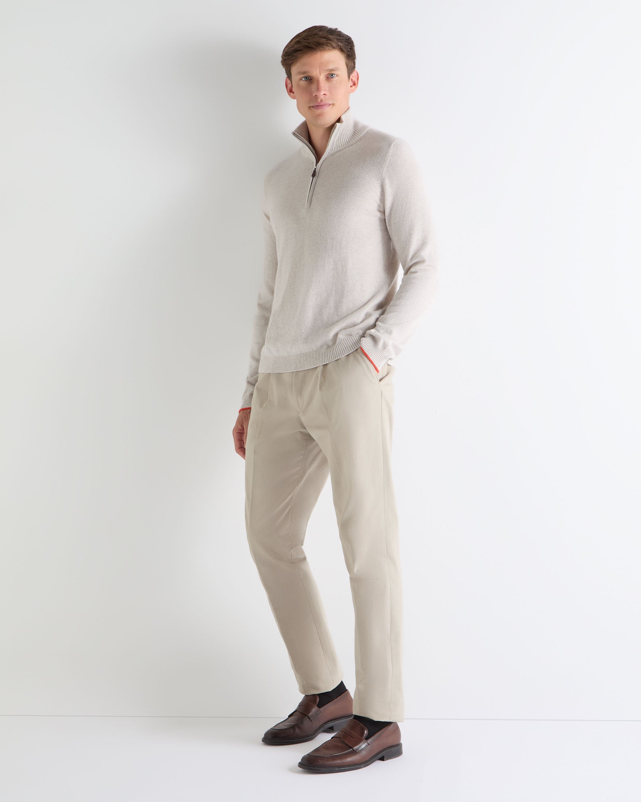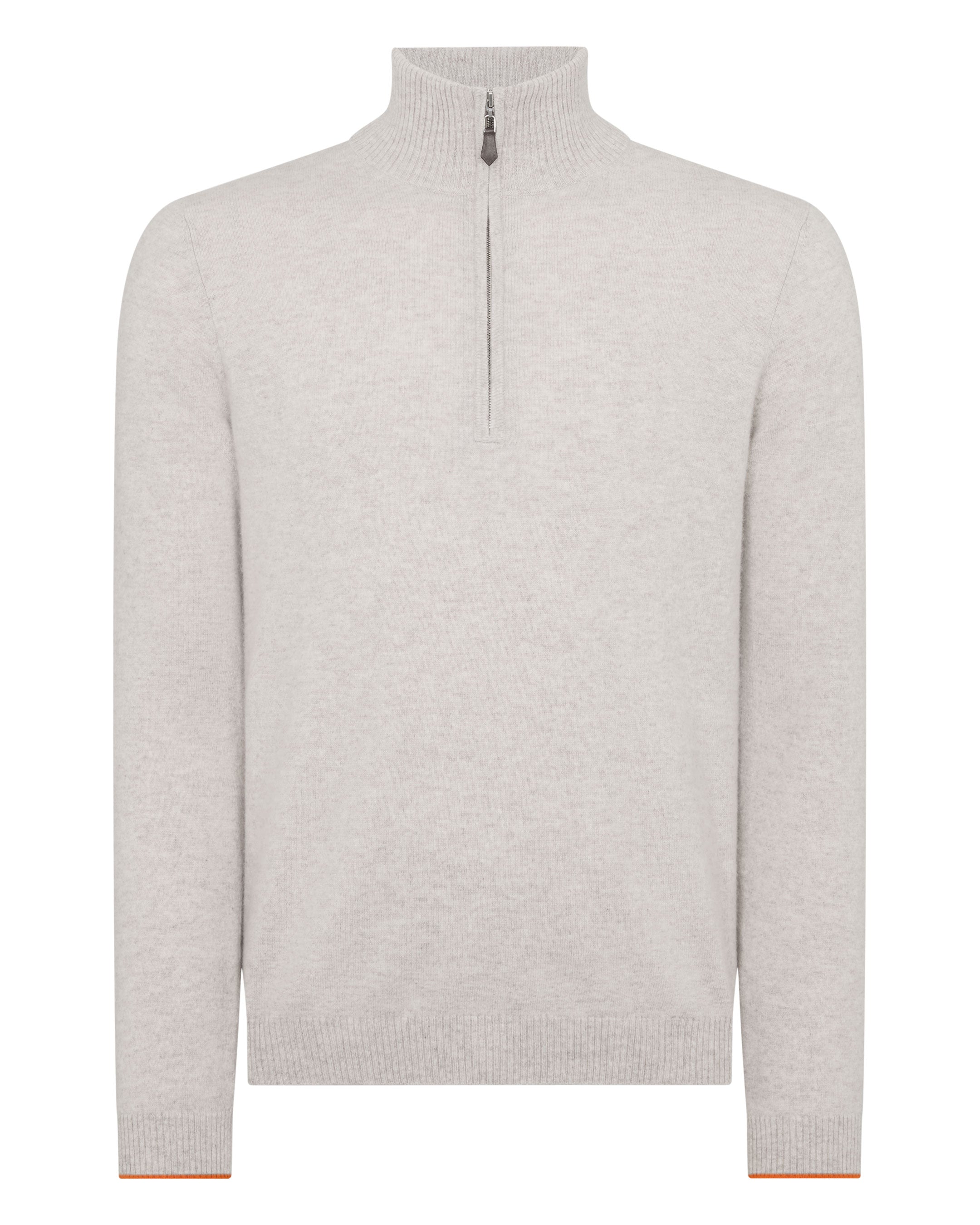 Made from 100% pure cashmere, the Tucci Half Zip combines practical versatility with refined everyday style. With subtle cuff tipping, a back neck trim in signature ‘Tucci orange’ and a concealed zipper placket, the Tucci Half Zip is a luxurious wardrobe staple. Also available in navy blue and arabica khaki green. Hand wash.