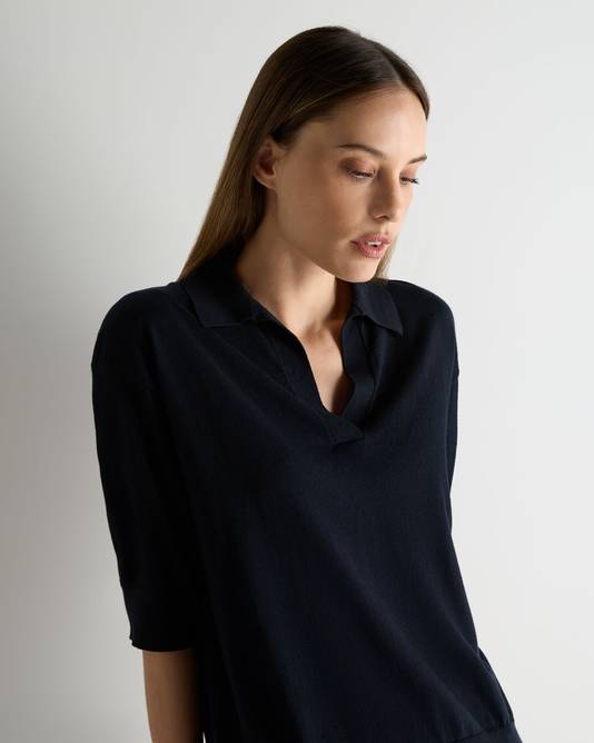 – Shaped with a relaxed open polo collar, offering a softer alternative to classic buttoned styles