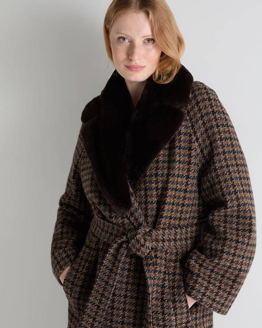 Women's Dogtooth Fur Trim Coat In Brown