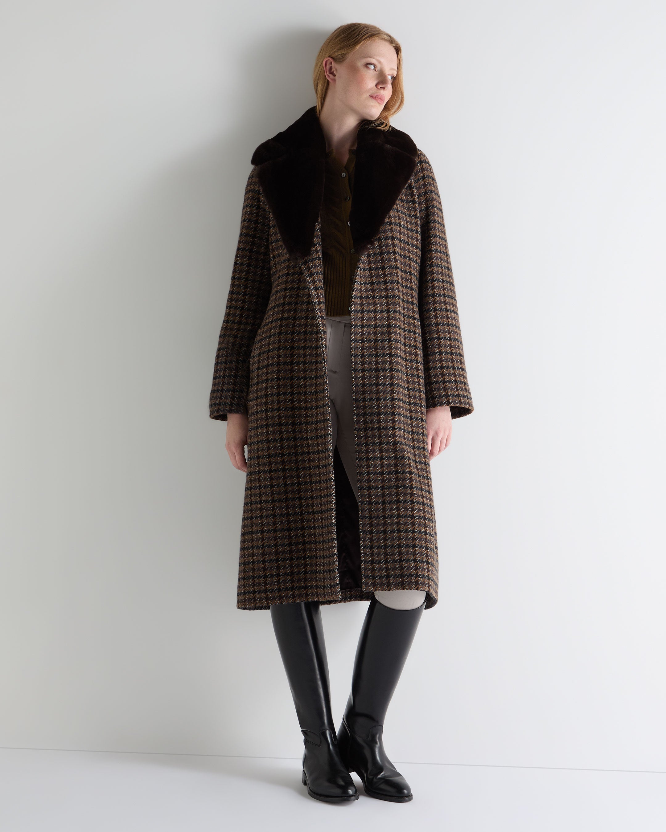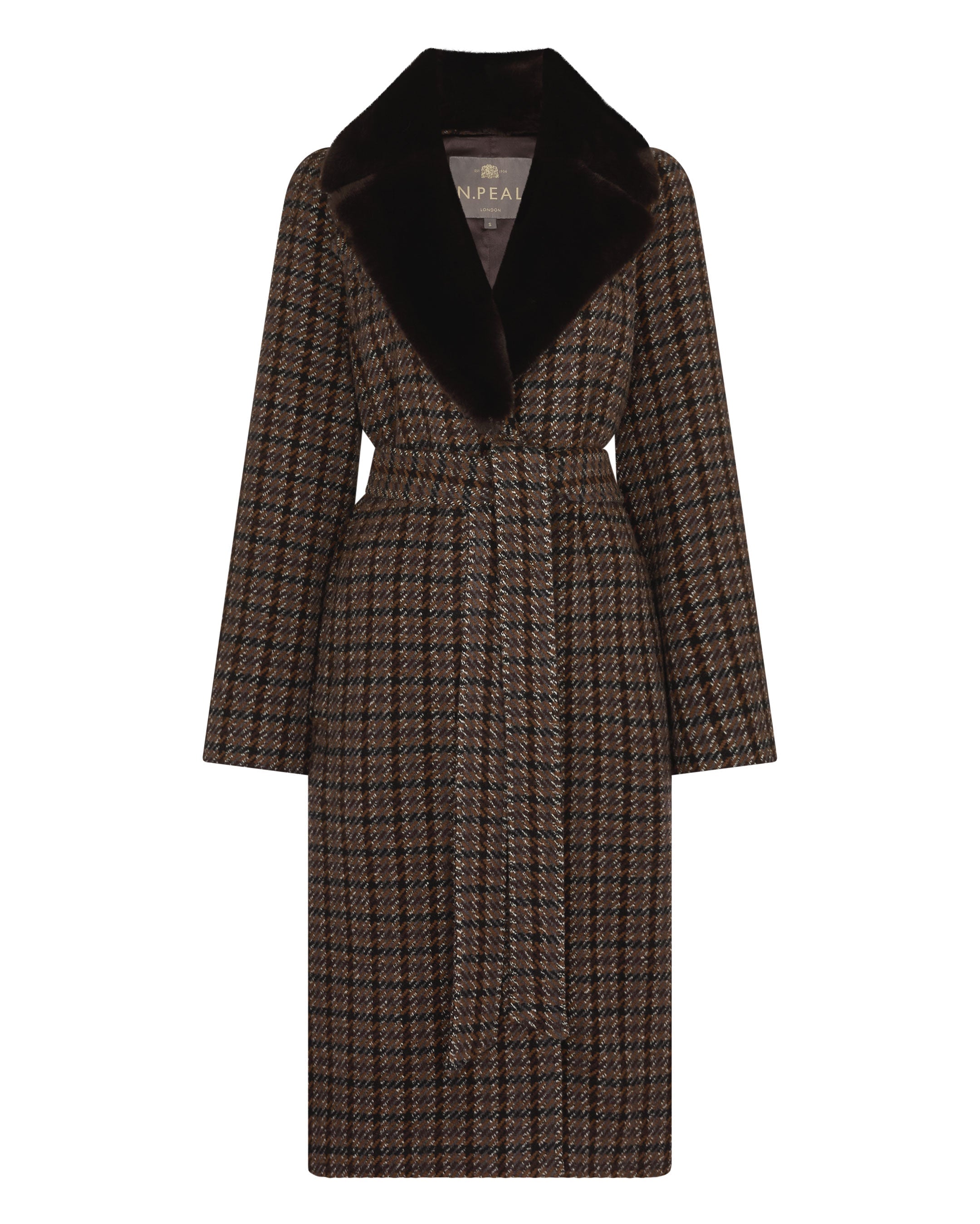 Refined and timeless, this longline dogtooth N.Peal coat is the epitome of understated luxury. The rich brown check nods to heritage tailoring, while the oversized detachable fur collar lends a sense of drama and warmth. Designed with a wrap silhouette and self-tie belt, it offers versatile styling — cinched for structure or left open for ease. A city-ready outer layer that travels effortlessly between destinations.