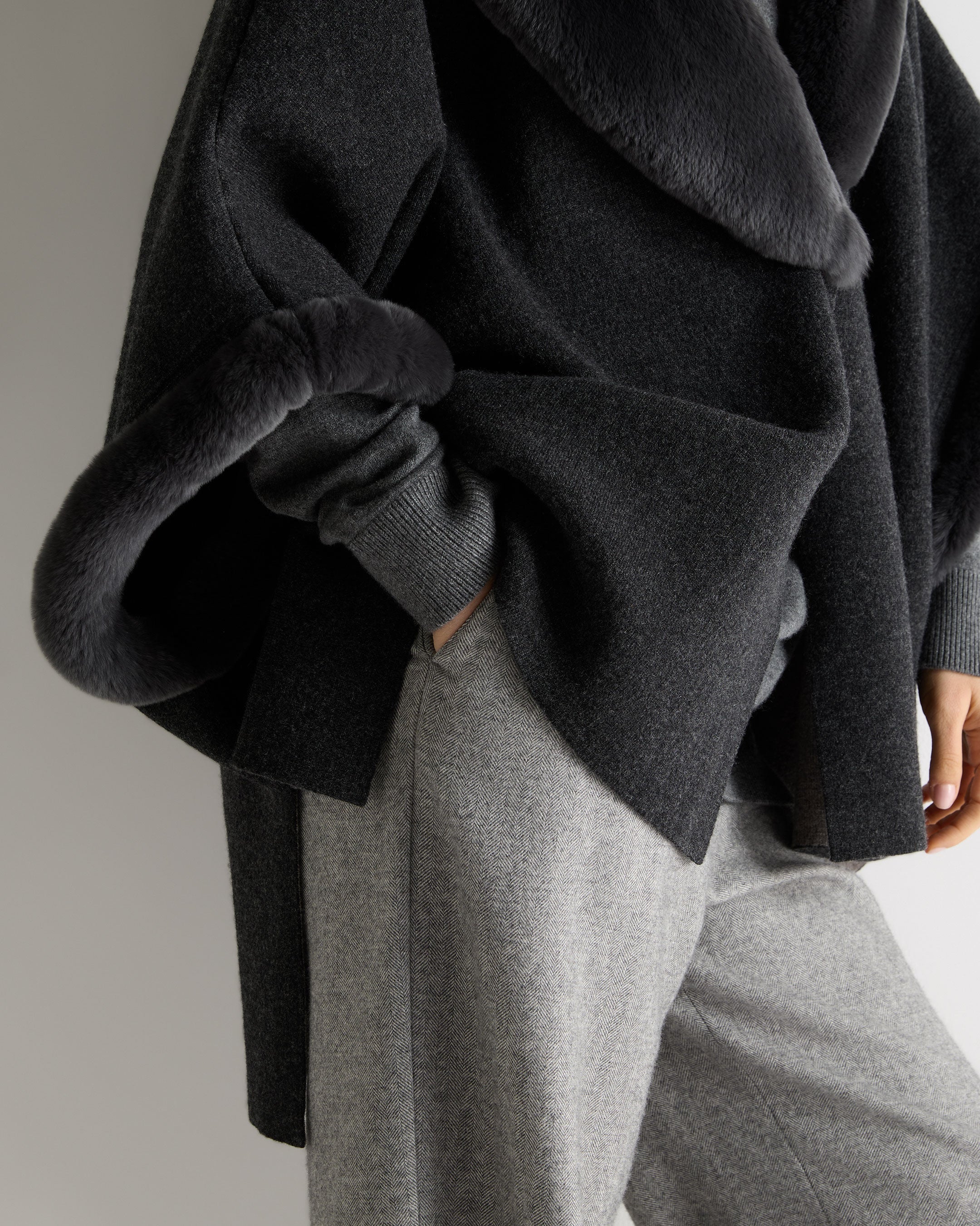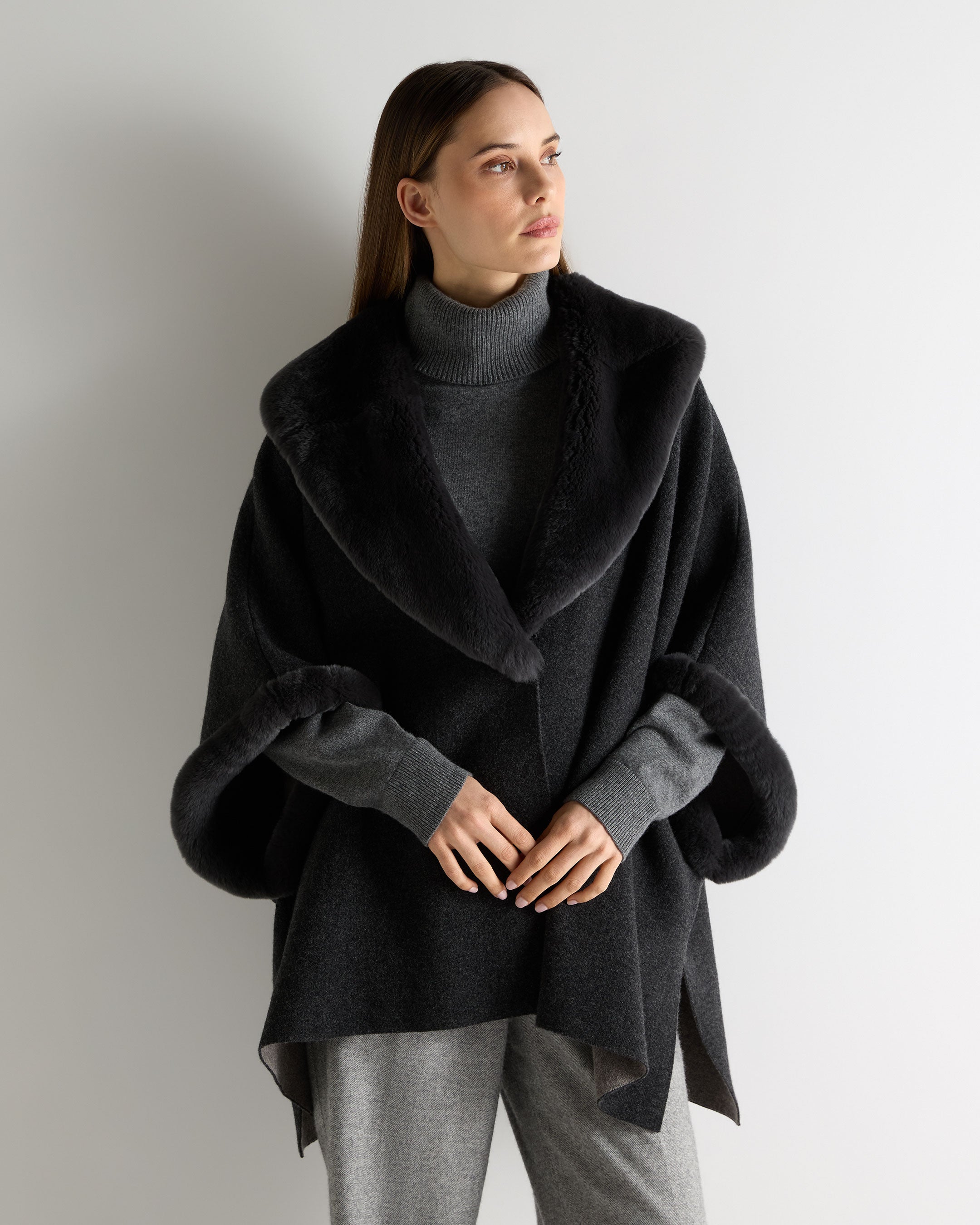 A sophisticated outer layer with statement appeal, this double-face N.Peal cape balances softness and structure with ease. The deep charcoal tone is refined and versatile, while a plush fur trim frames the silhouette — adding indulgent warmth and unmistakable luxury. Designed in a generous shape that drapes effortlessly, it works equally well layered over tailoring or off-duty knits.