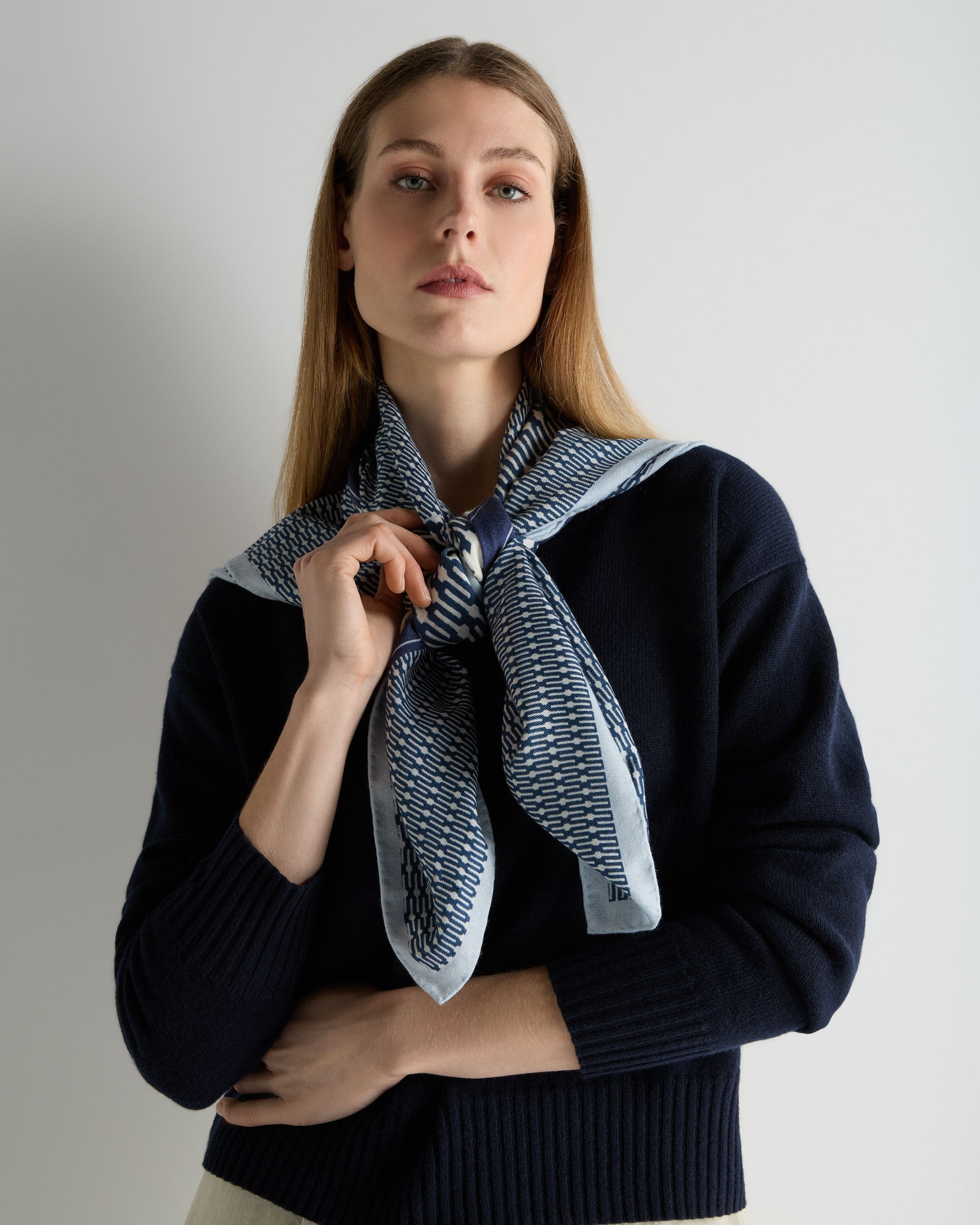 A graphic accent designed to travel effortlessly, this geo print foulard brings quiet confidence to everyday dressing. Lightweight yet refined, it is the kind of piece that elevates a simple knit, carries neatly in hand luggage, and adds polish from morning meetings to evenings spent exploring somewhere new.