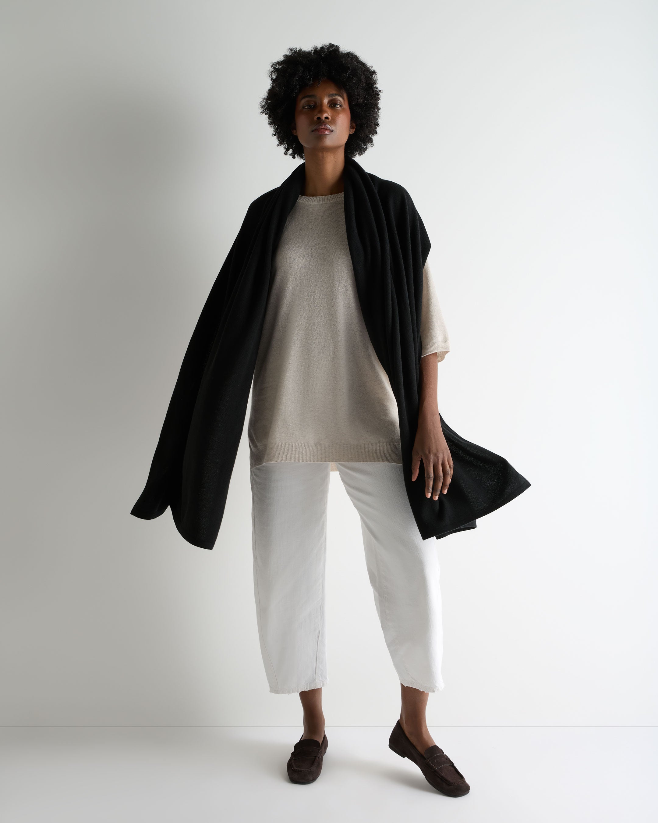 An elegant layer designed for ease and movement, this cashmere shawl brings quiet refinement to everyday dressing. Effortlessly draped and beautifully fluid, it’s the kind of piece you reach for on travel days, cool evenings or when a look calls for a soft finishing touch.