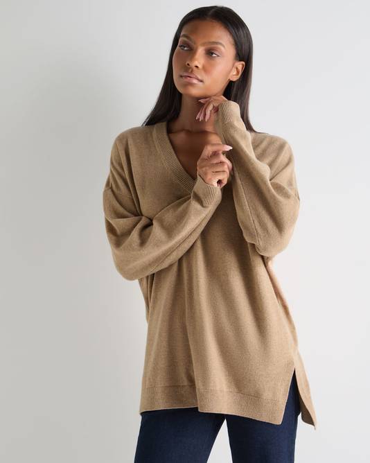 Women's Longline V Neck Cashmere Sweater In Cappuccino Brown