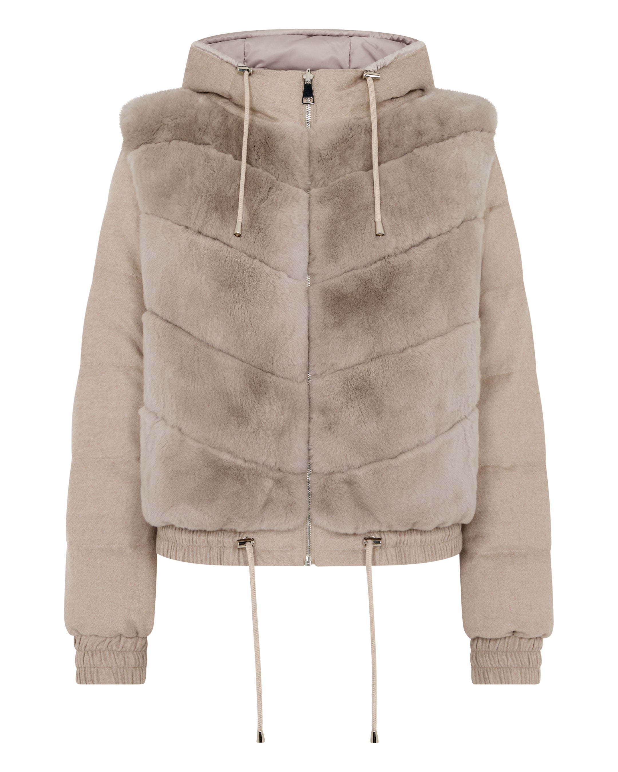 Blending refined texture with modern ease, this padded jacket is a luxurious essential for colder days. With its sculpted rex fur front, softly quilted arms,...
