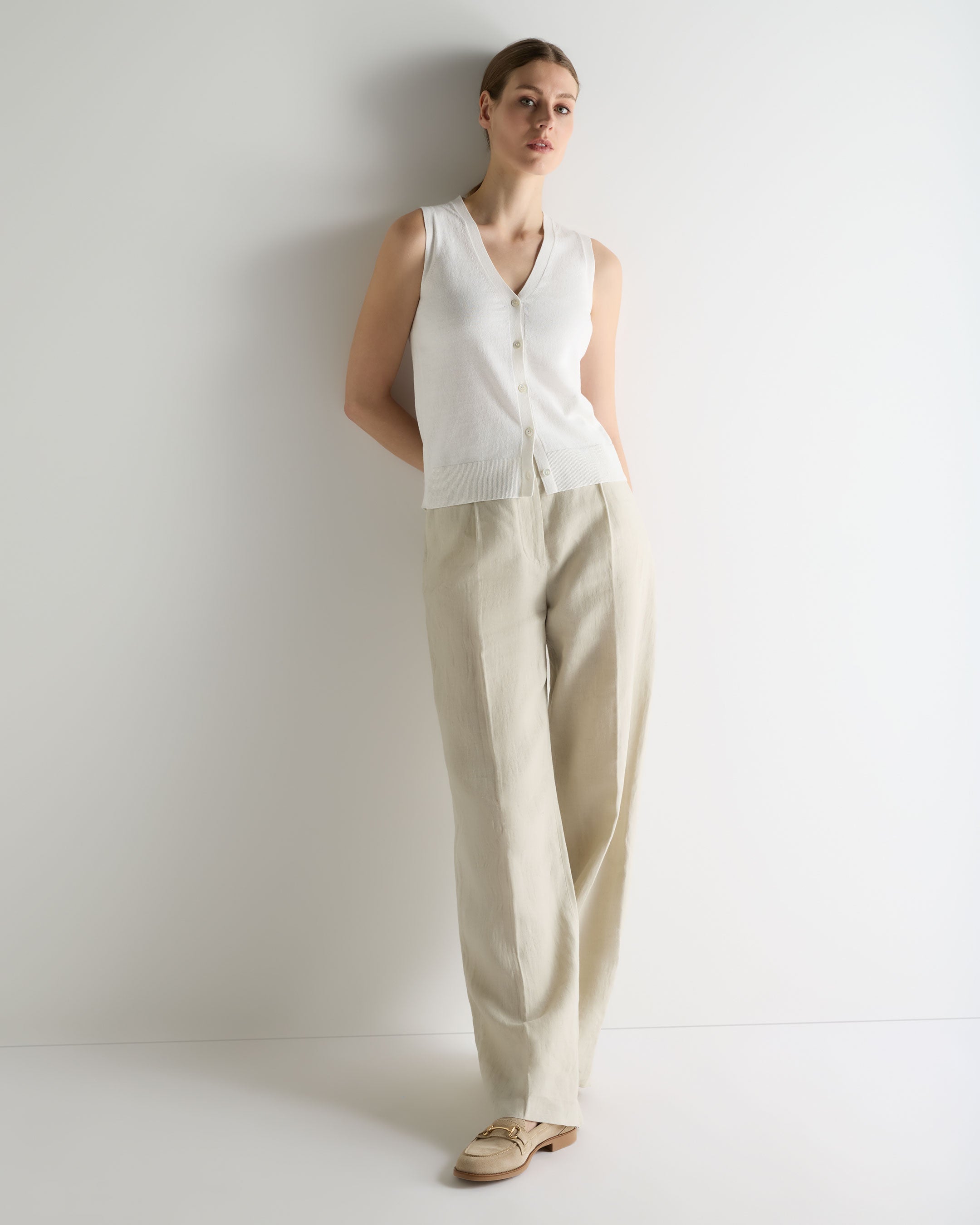 A considered warm-weather layer that brings quiet structure to relaxed dressing, this linen-blend tank top is cut with the ease of summer in mind. Clean and pared back, it is the kind of piece that slips seamlessly into travel wardrobes — worn on sun-washed mornings, unhurried lunches and evenings that call for something understated yet pulled together.