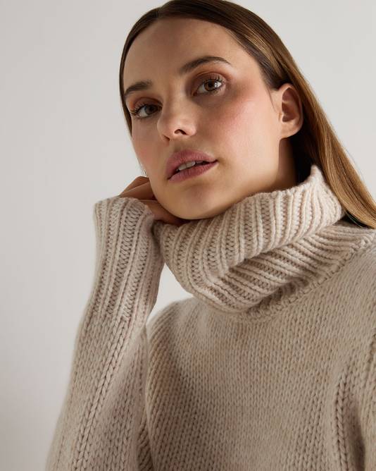 This sweater epitomises the beauty of simplicity, elevated in every stitch. This super chunky roll neck sweater is spun from 10-ply organic cashmere for irresistible warmth and softness. With its generous ribbed trims and softly rolled collar, it is designed for the quiet moments — slow mornings, crisp walks, and winter escapes. A true layering staple, shaped by craft and comfort in equal measure.