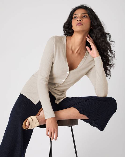 A refined layer with year-round versatility, this superfine cashmere V-neck cardigan brings understated luxury to everyday dressing. Its clean lines and lightweight 1-ply construction create an elegant silhouette that pairs effortlessly with denim, tailoring or travel separates. Worn buttoned for a polished look or open over a simple tee, it delivers the kind of quiet sophistication that elevates even the most relaxed moments.