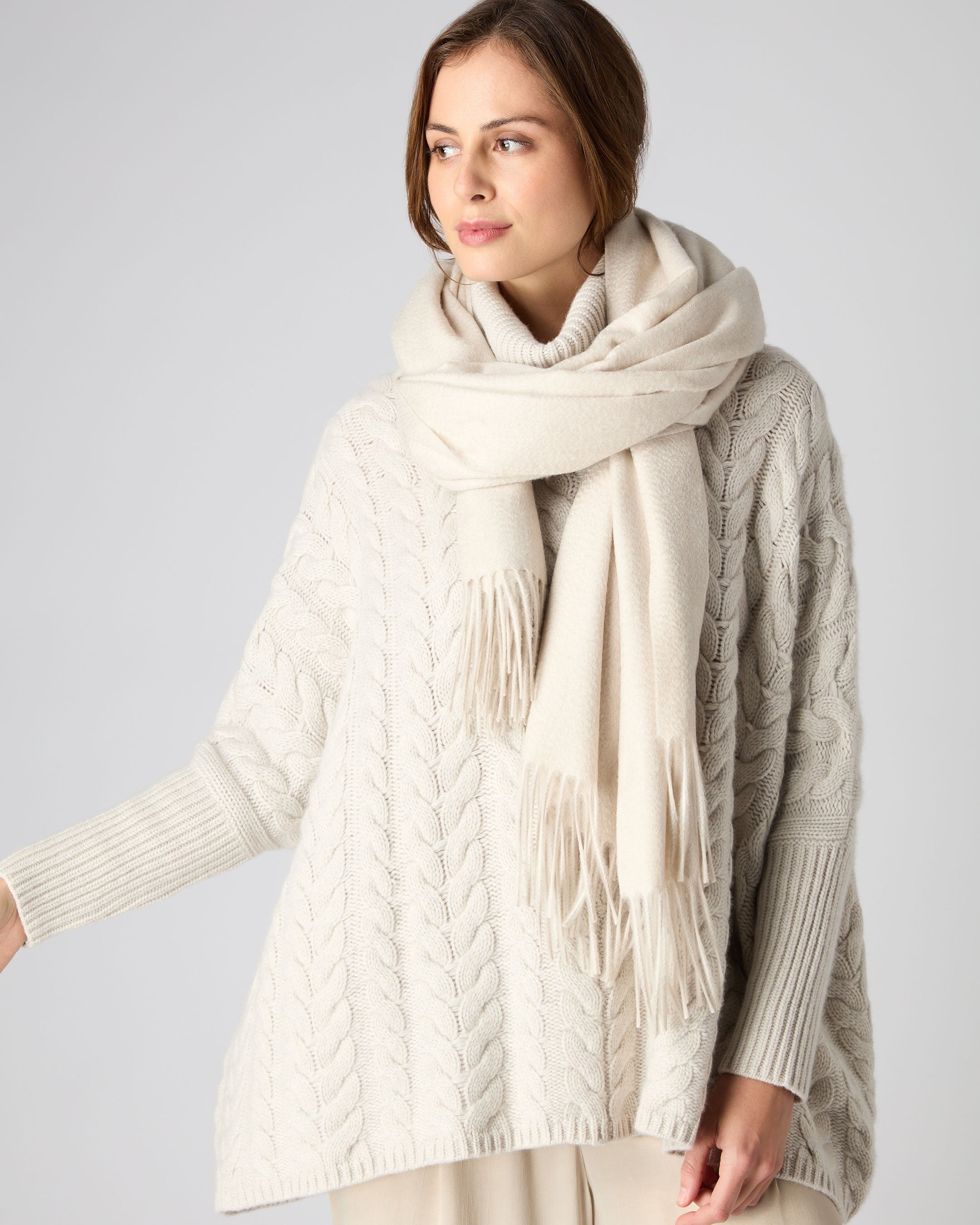 Effortless warmth, designed to travel well. This generously sized woven cashmere shawl brings soft structure and quiet elegance to your layering — equally suited to countryside weekends, long-haul flights or as an eveningwear cover-up. Finished with refined fringe detailing for a subtle sense of movement.